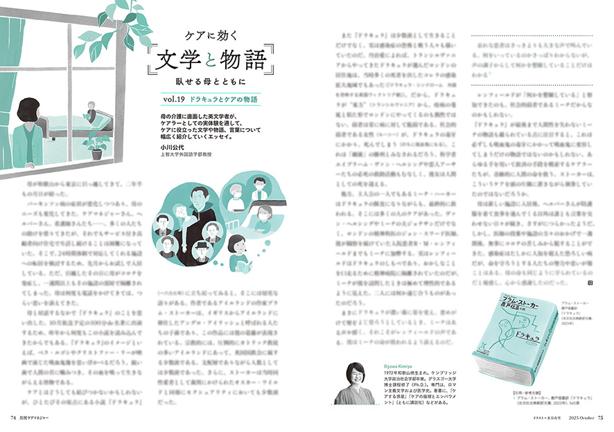 ケアマネジャー向け専門誌『ケアマネジャー』2025年10月号、小川公代先生の連載エッセイ「ケアに効く文学と物語ー臥せる母とともに」のイラストレーションを担当いたしました。
